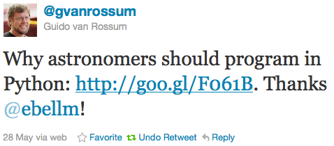 My post outlining the reasons why I think Python should be the language of choice in astronomy today got a lot more attention than I expected thanks to discussion on Hacker News and a link from Guido himself. Psychological factors encourage particular attachment to one’s tool choices, but the discussion has been constructive.